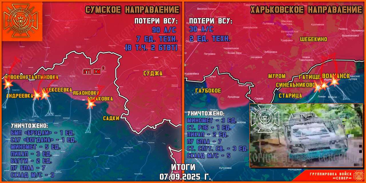 На Сумском направлении по всему участку фронта работает российская авиация, нанося поражение скоплениям сил ВСУ. В южной части Юнаковки продолжаются бои. Противник активизировался и контратакует на флангах наступающей группировки войск «Север», одновременно нанося удары по объектам гражданской инфраструктуры и мирным жителям. В районе населённого пункта Иволжанское Сумской области ракетным ударом уничтожен пункт временной ВСУ. Среди убитых начальник заставы лейтенант Андрей Гаджук. За сутки наши бойцы отразили три контратаки врага в районах Алексеевки, Андреевки и Новоконстантиновки (Перше Травня). В ходе отражения уничтожено до 50% личного состава, принимавшего участие в атаках, а также БМП «Бредли».