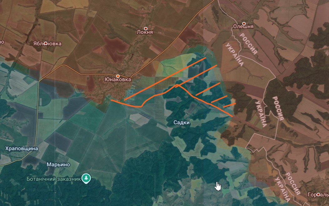 Русские части, наступающие в Сумской области, соединились между Юнаковкой и Олешней, сообщает Телеграм-канал «Шёпот фронта».