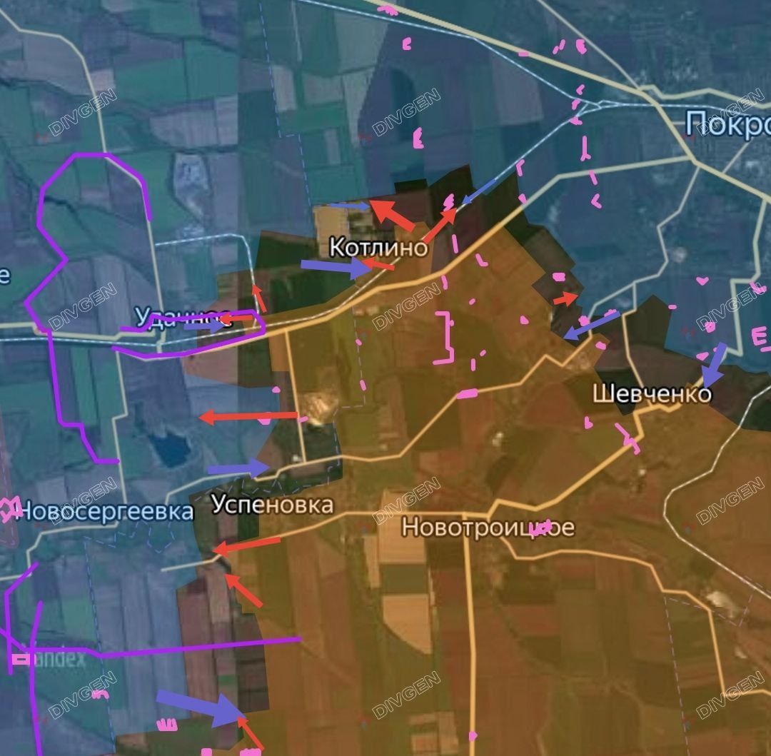 На Покровском направлении российские войска продолжают наступательные действия с успешным продвижением в Успеновке, с тяжёлыми боестолкновениями на рубежах Удачное – Котлино – Зверовое – Песчаное – Шевченко. Боевые действия продолжаются в районе Лысовки, где силы ВС РФ оказывают активное давление на позиции противника.