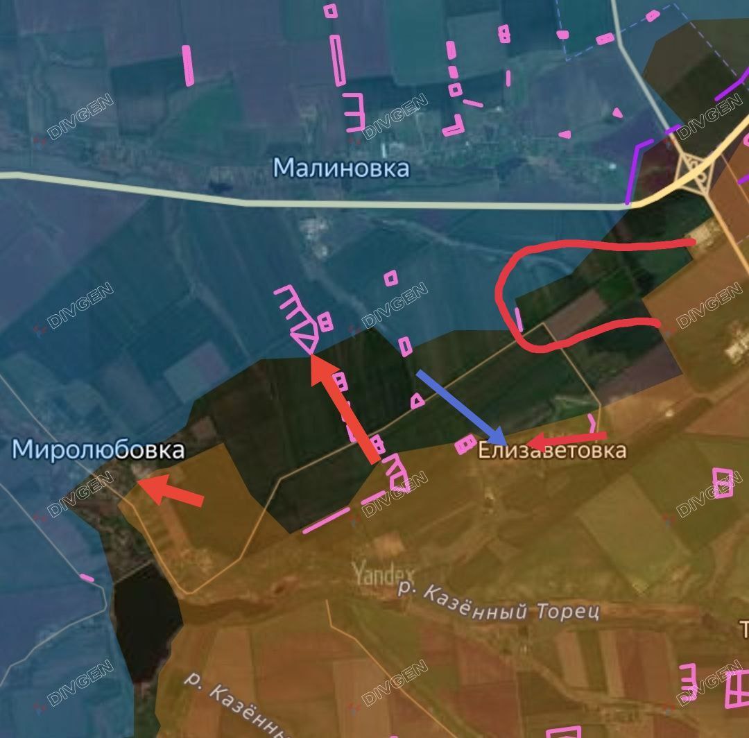 Наши подразделения продолжают атаковать южнее Малиновки, пытаясь занять посадки севернее и северо-западнее Елизаветовки, чтобы исключить контратаки противника на Елизаветовку (противник контраковал Елизаветовку, ней идут встречные бои) и обеспечить фланг при продвижении в Миролюбовке и далее к Новоэкономическому. В Миролюбовке бои идут в северо-восточной части за ангары.