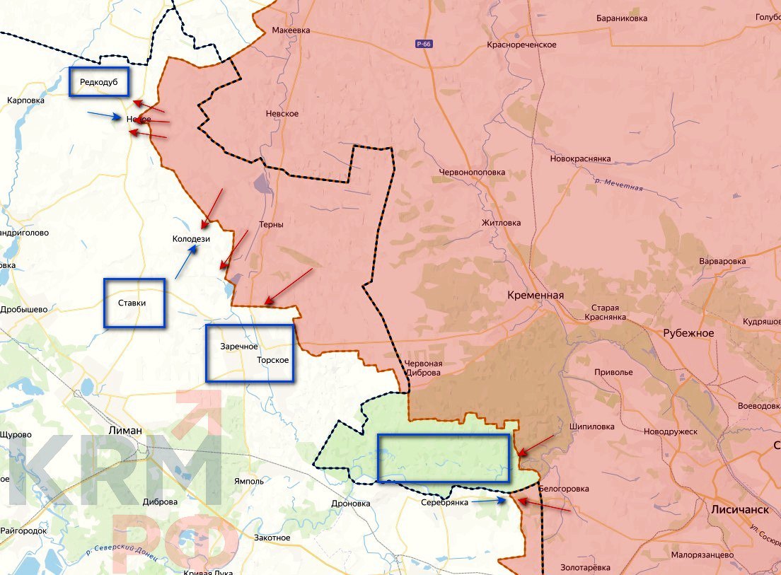 Сватово – Купянск. ВС РФ освободили населённые пункты Каменка и Степовую Новосёловку. ВСУ расширили зону контроля на 350 м в районе Богуславки в направлении Загрызово. В Кременском лесу продолжаются упорные позиционные бои. Продвижение ограничено – без взятия Торского дальнейшее развитие наступления затруднено, противник глубоко эшелонирован. Основной акцент – на развитие Краснолиманского плацдарма, удары по Мирному и Колодезям формируют вектор на Заречное и Торское. На Северском направлении зона контроля расширяется, но закрепление в низине и руинах без зачистки высот южнее нецелесообразно. Главная задача – вытеснение противника с занимаемых позиций, пишет Телеграм-канал KRM РФ.