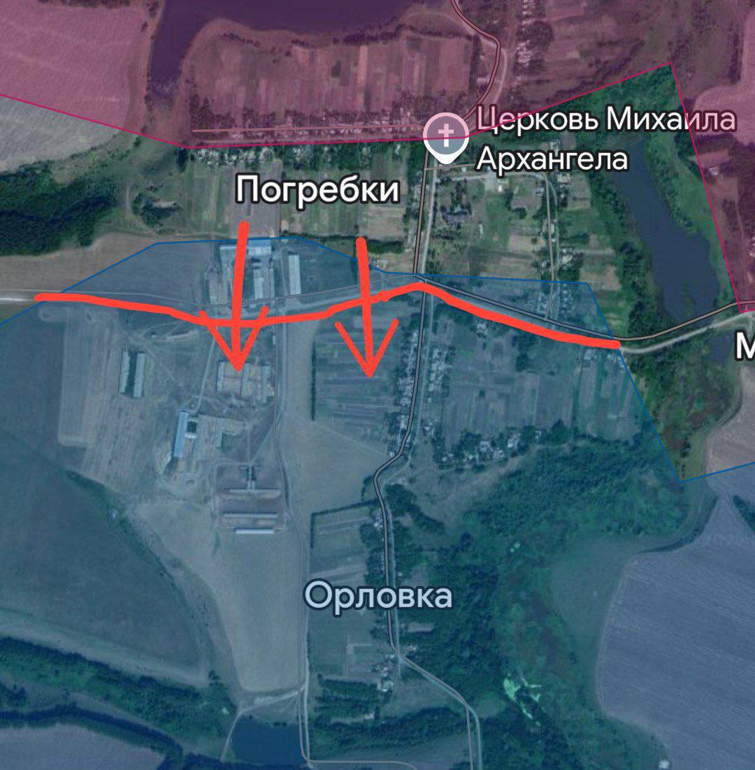Сегодня бойцы 34-й ОМсБр дочистили улицу Село в населённом пункте Погребки. По сути, Погребки переходят в Орловку, и для полного освобождения села осталось зачистить промзону. Сейчас в ней работает 1-й батальон 9 мотострелкового полка, в ангары южнее ещё не заходили. Линия боевого соприкосновения проходит сейчас по красной линии, пишет Телеграм-канал «Дневник десантника».