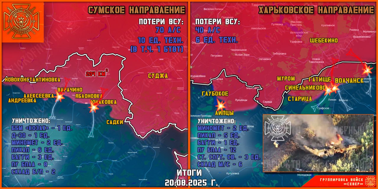 На Сумском направлении бойцы группировки войск «Север» сохраняют высокий темп продвижения в Юнаковке. Авиация ВКС РФ активизировала удары по местам скопления техники и личного состава ВСУ по всей линии фронта в Сумской области. Противник активизировался на Тёткинском участке.