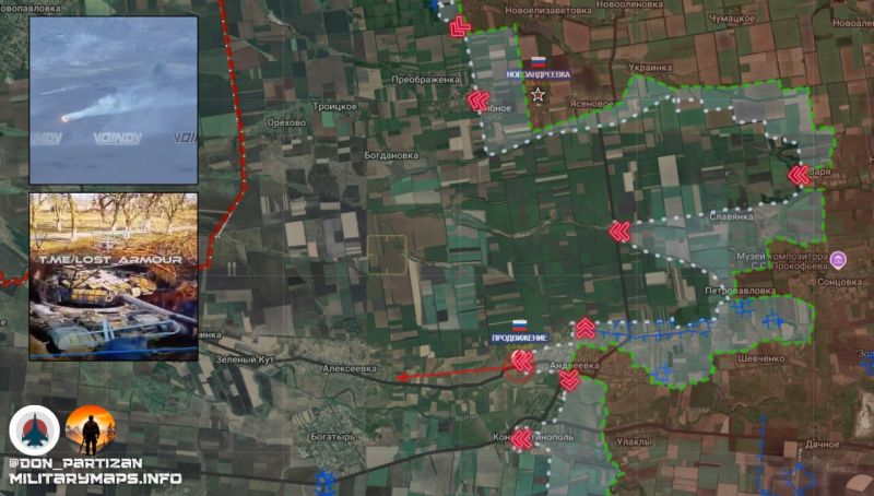 От освобождённой Надеждинки наши атакуют с Юга и Запада. Продолжаются ожесточённые бои в Успеновке. Возобновился штурм Лысовки, наши закрепились в южной части, выдавливают ВСУ из северной. Враг активизировался в районе Новой Полтавки. В районе Удачного наши штурмуют укрепы противника.