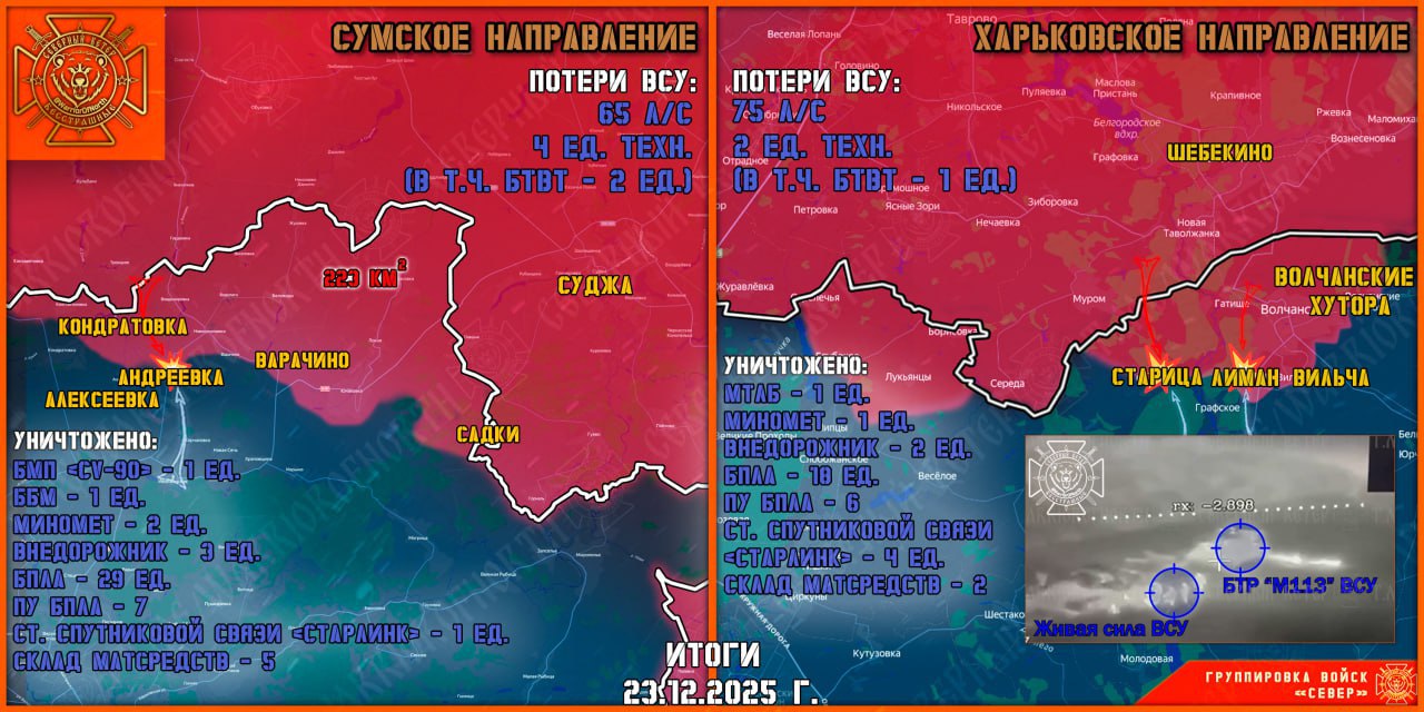 Подразделения группировки войск «Север» улучшили тактическое положение, нанесли поражение формированиям ВСУ, бригады теробороны, бригады нацгвардии и двух пограничных отрядов погранслужбы Украины в Сумской области. На Харьковском направлении нанесено поражение подразделениям ВСУ в Харьковской области. ВСУ потеряли до 175 военнослужащих.