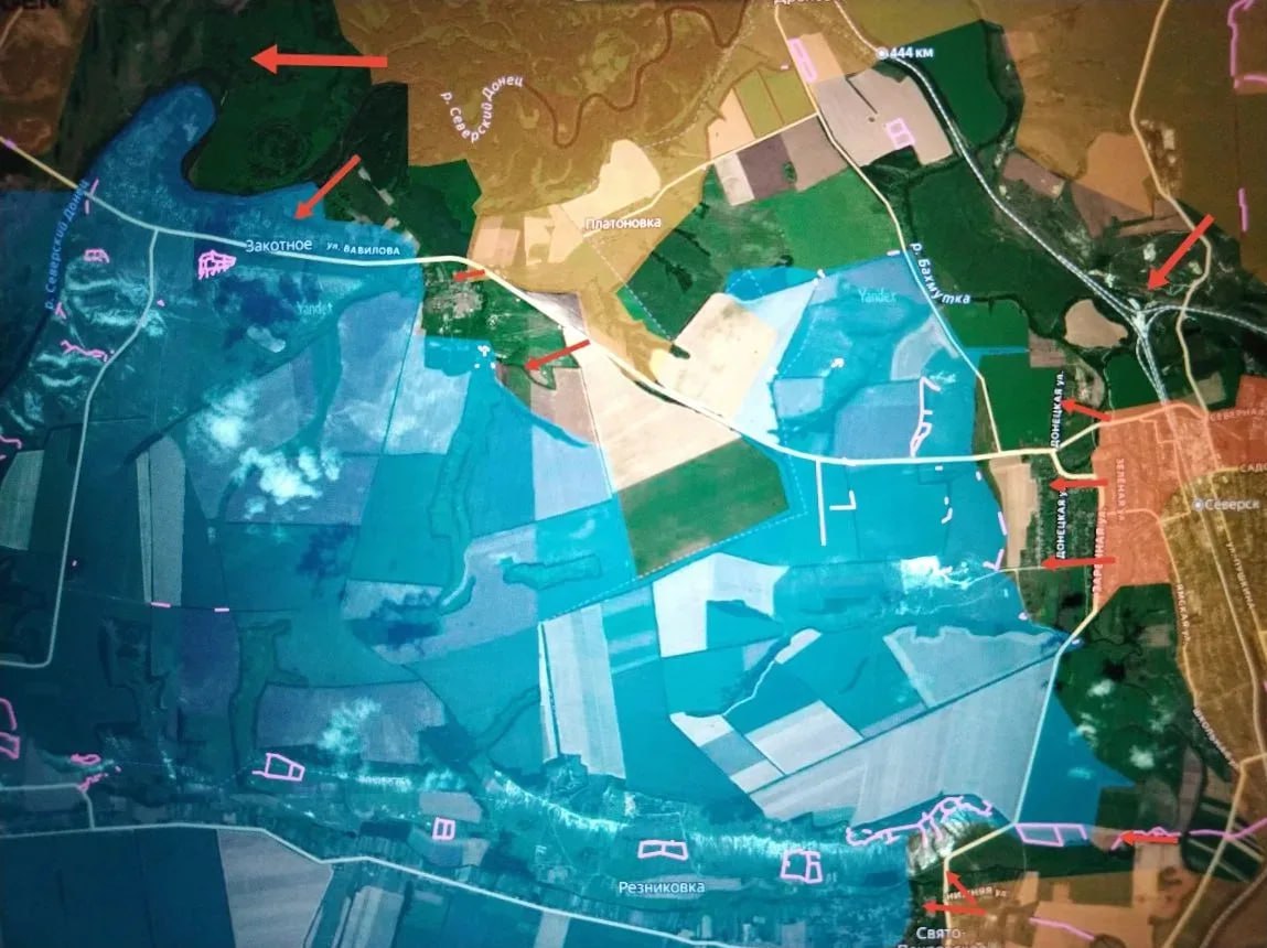 В Северске на Краснолиманском направлении войска группировки войск «Юг» проломили оборону противника, форсировали реку Бахмутка, и вышли к улице Заречная. До окраины – 600 м, но сразу за Северском у ВСУ подготовлен укрепрайон на господствующей высоте (в районе посадок на склоне и мелового карьера). По данному укрепрайону интенсивно работают средства дистанционного поражения. В тыл этому укрепрайону и южнее (в направлении Резниковки и Кирово ВС РФ атакуют со стороны Платоновки. Большую роль в сложившейся обстановке могут сыграть действия наших войск именно со стороны Платоновки. Успешные действия на этом участке и в районе Пазено, где ВС РФ атакуют в лесной зоне в направлении Рай-Александровки, могут обвалить довольно большой участок фронта ВСУ на подступах к Николаевке (ворота в Славянск) с востока.