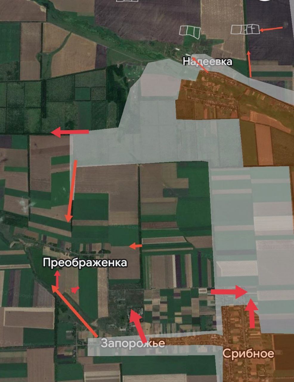 Наши парни атакуют в направлении западной части Новосергеевки, (которая территориально находится отдельно от восточной), продвигаясь севернее Успеновки и вдоль Новоалександровки по балке Шумилина. Идут интенсивные бои за фермы и опорники северо-западнее Надеждинки. Южнее самой Надеждинки наши атакуют в западном направлении на Котляровку. С севера и юга, со стороны посëлка Запорожье, идут атаки Преображенки.
