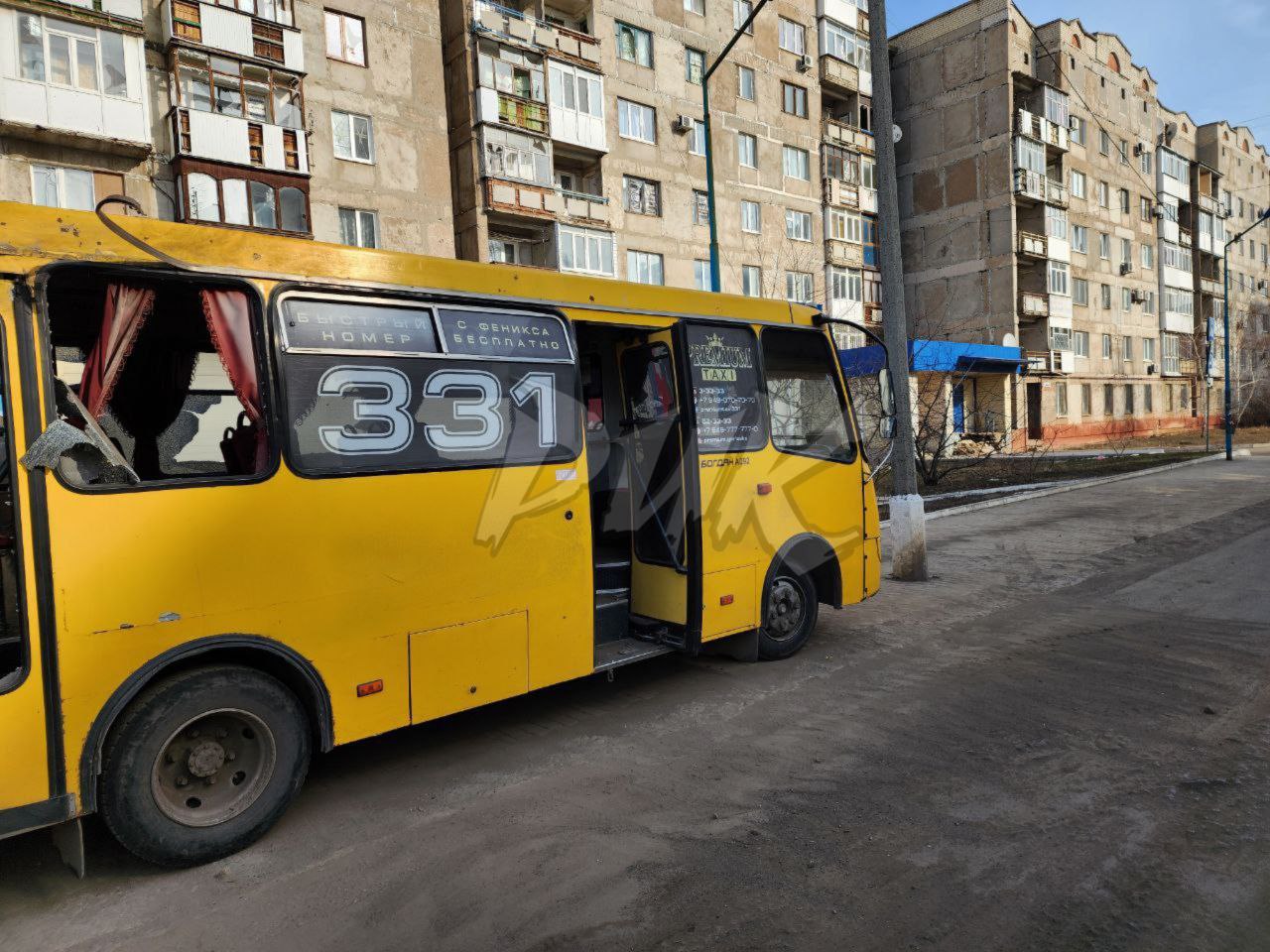 Преступления Украины. В результате сброса взрывчатки с БПЛА ВСУ по улице Жукова в жилом массиве «Строитель» Никитовского района Горловки повреждены два маршрутных автобуса.