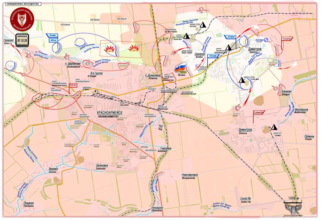 Минобороны РФ сообщило, что подразделения группировки войск «Центр» завершили освобождение населённого пункта Ровное Донецкой Народной Республики, продолжили уничтожение группировки ВСУ, окружённой в населённом пункте Мирноград (Димитров), и зачистку населённого пункта Гришино ДНР. Продолжается «удушение» остатков группировки противника в Димитрове. Находящиеся в плотном «котле» подразделения ВСУ продолжают сопротивление, штурмовые группы ВС РФ не спеша, тщательно зачищая городские развалины, продвигаются вперёд. После освобождения Ровного наши бойцы вышли к началу широкой, разветвлённой и протяжённой балки Грузская, которая проходит через центр северных кварталов Димитрова и выходит к реке Казённый Торец у северных окраин Новоэкономического. «Вариться» Димитровскому котлу осталось недолго. И выхода из него нет. Есть только вход и то – не тот, пишет военкор Марат Хайруллин.