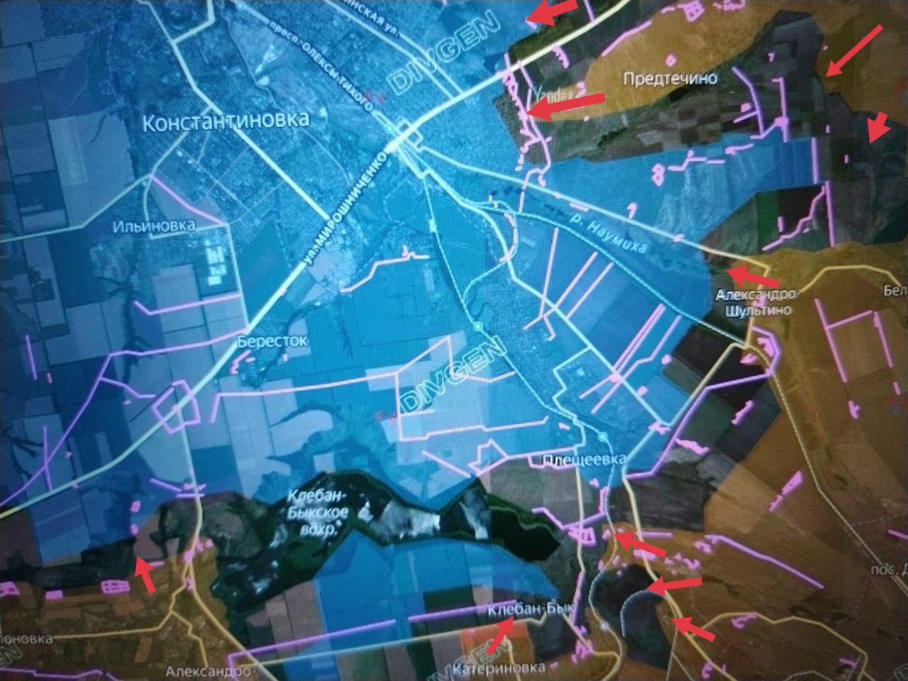 По некоторым косвенным признакам можно сделать осторожный вывод, что активность в районе Константиновки с российской стороны существенно возросла и дело постепенно переход в перемалывание резервов ВСУ с целью дальнейшей изоляции всего района. Такая конфигурация выглядит как реализация сразу двух задач: во-первых, усиление давления на украинскую оборону по всей линии, чтобы у командования ВСУ не было возможности маневрировать резервами, во-вторых, создание эффекта «расшатывания» фронта на нескольких участках сразу. И в первом, и во втором случае торопиться российским войскам нецелесообразно по нескольким причинам.