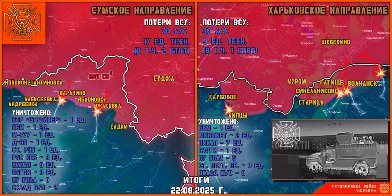 Подразделения группировки войск «Север» нанесли поражение живой силе и технике ВСУ в Сумской области. На Харьковском направлении улучшено положение по переднему краю, нанесено поражение подразделениям ВСУ в Харьковской области. ВСУ потеряли до 150 военнослужащих.