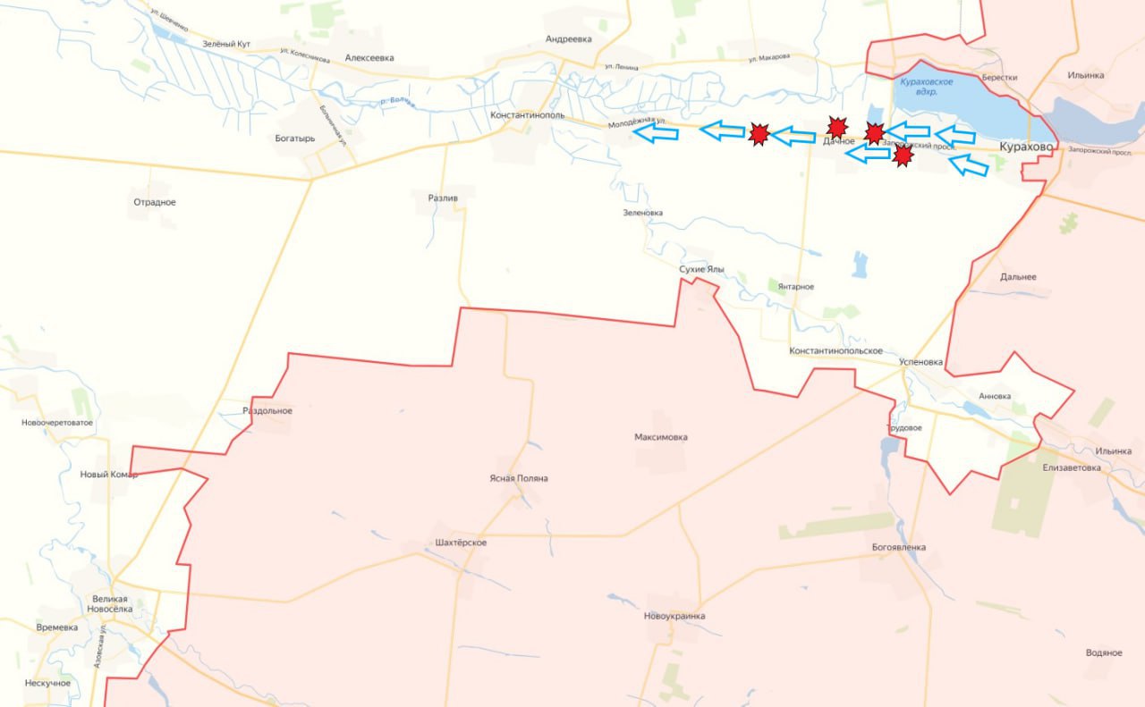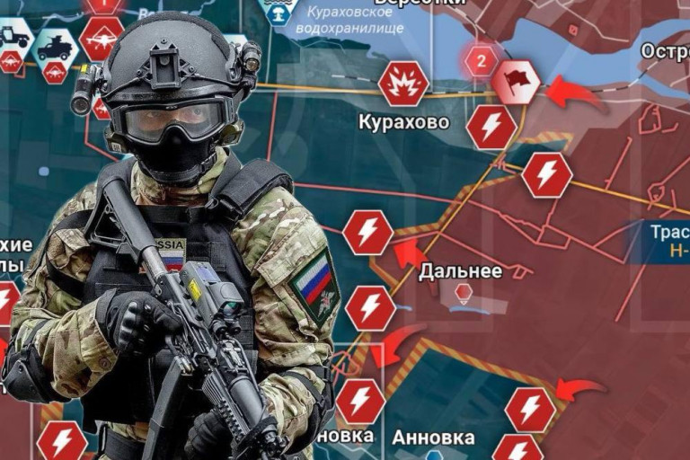 Любопытно, что практически идентичная Покровску ситуация складывается и к западу от Курахова. Там, если вспомнить детали развития очеретинской операции ВС России, удар развивается таким образом, что удержать какое-либо направление без ущерба для обстановки в целом для ВСУ становится невозможно.