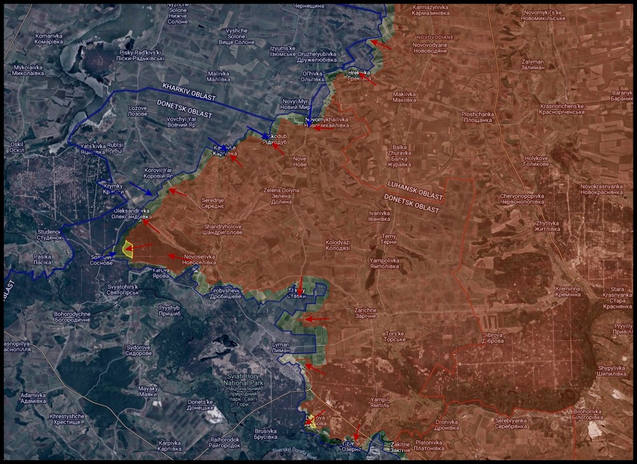 Главная проблема для нас – у противника остаётся частичное преимущество в малом небе FPV-дронов. Они постоянно атакуют с воздуха, минируют подходы и корректируют огонь. Из-за этого продвижение идёт медленно, метр за метром. Дорога на Святогорск пока не перерезана, но находится под нашим огневым контролем. Последний закрас в районе Соснового – это, скорее работа наших ДРГ. И Яровая тоже пока в серой зоне. Ситуация, как и ранее, довольно напряжённая. Противник не стал технически слабее, просто мы стали сильнее. Штурмовать было всегда тяжело. Но стоит заметить, что наши войска действительно продолжают давить, стараясь выбить его с ключевых позиций, пишет Телеграм-канал «KRM РФ».