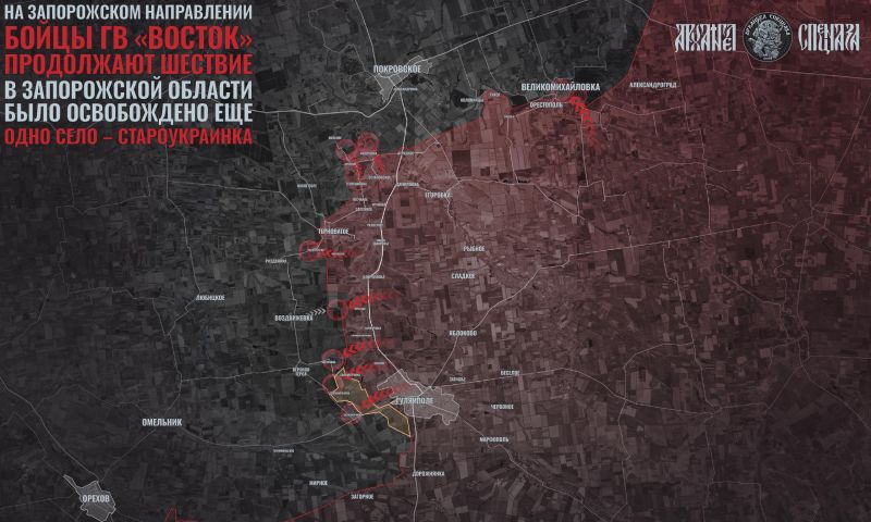 Армия России уверенно продвигается к очередной линии оборонительных позиций противника, построенных с опорой на реку Верхняя Терса на участке Новониколаевка – Орехов. По информации Министерства обороны России: освобождён населённый пункт Староукраинка Запорожской области. На Запорожском направлении соединения и части группировки «Восток» выходят на хребет водораздела рек Гайчур и Верхняя Терса, на линию железной дороги Покровское – Зализничное, проламывают линию обороны противника на западных скатах междуречья. Готовятся плацдармы для действий по охвату и освобождению транспортных узлов линии обороны ВСУ Покровское – Гуляйпольское: населённые пункты Риздвянка, Воздвижевка, Верхняя Терса и Зализничное.