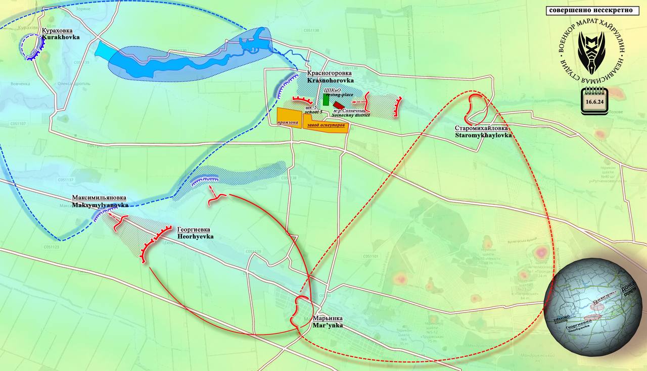 В Георгиевке наши подразделения вышли к западным окраинам села и освободили промзону,  расположенную с южной стороны н.п. Сейчас практически весь населённый пункт находится под контролем наших вооружённых сил. ВСУ пока ещё сидят на части улицы, идущей севернее основной территории села и примыкающей к каскаду ставков в направлении к Красногоровке.