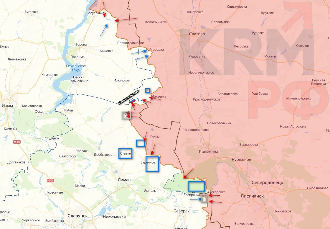 Кременской лес. ВСУ атаковали российские позиции в районе гидрологического заказника «Кременские каптажи» (выезд из Кременной в сторону Торского), а также в лесном массиве между Червонной Дибровой и Кузьмино. ВС РФ в свою очередь нанесли удары по позициям противника в районе острова Мёртвый Донец, а также юго-западнее Червонной Дибровы. Противник продолжает наносить удары по Кременной и её окрестностям.
