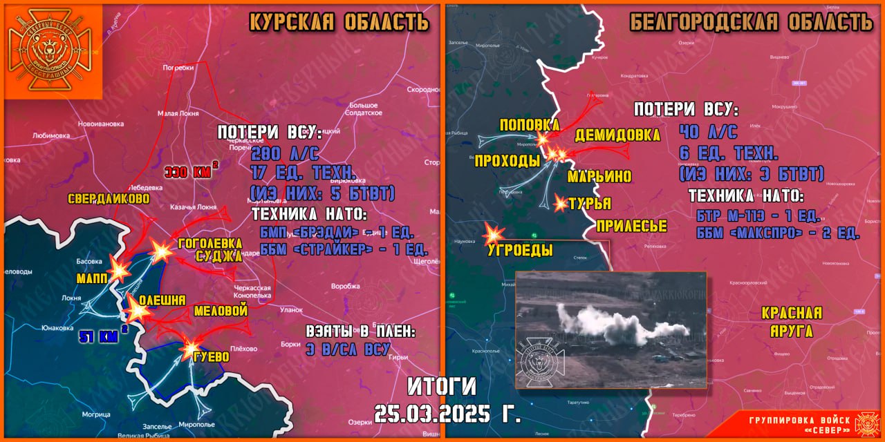 Дважды за минувшие сутки противник пытался прорваться в Поповку. В ходе нашего огневого воздействия большая часть живой силы противника уничтожена, оставшиеся в живых всушники бежали на территорию Сумской области. Три раза в пешем порядке и на квадроциклах, а один раз на БТР враг выдвигался в направлении Демидовки. Живая сила и мобильные средства передвижения уничтожены «северянами», бронетранспортёр ВСУ подорвался на мине на территории Сумской области и был добит нашим FPV-дроном.