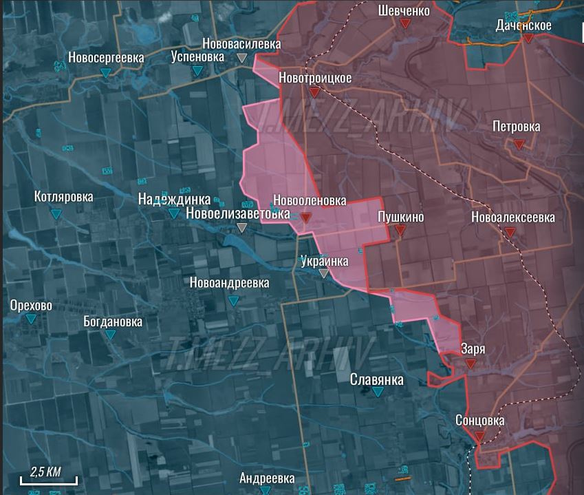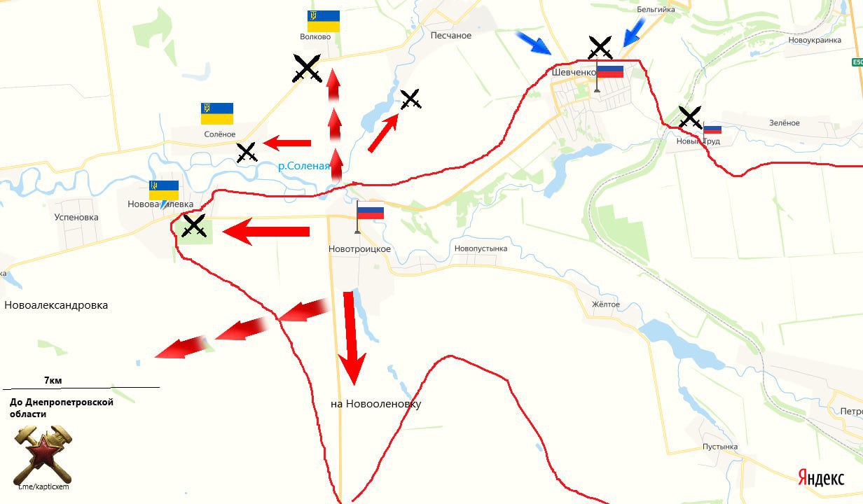 Кроме того, наши подразделения сегодня продвинулись в посадках/полях между Украинкой и Славянкой, что при дальнейшем успешном движении несёт угрозу обхода этих населённых пунктов, пишет военкор Юрий Котенок.