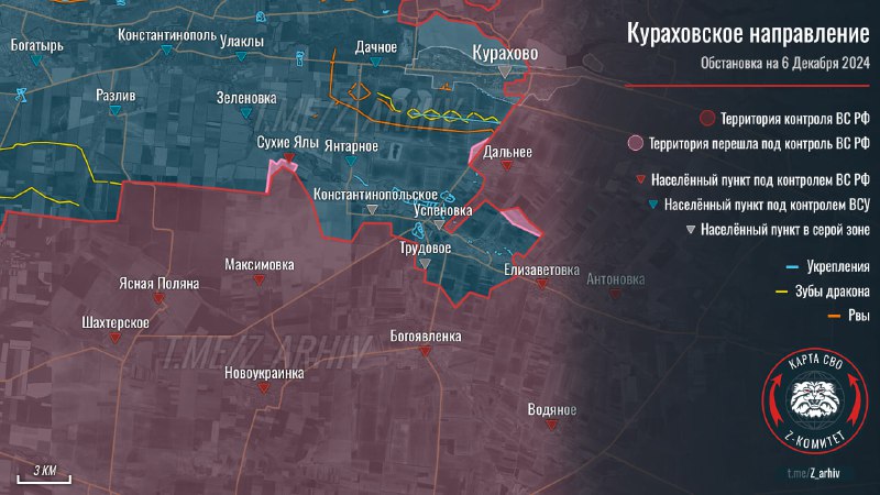 Сухие Ялы противник потерял ещё 5 декабря, Константинопольское освободили вчера. Будем надеяться, что сегодня поступит информация об освобождении ещё нескольких сёл, где укры будут зажаты, если не уйдут. Да и уйдут не все. Речь об Анновке и Успеновке.