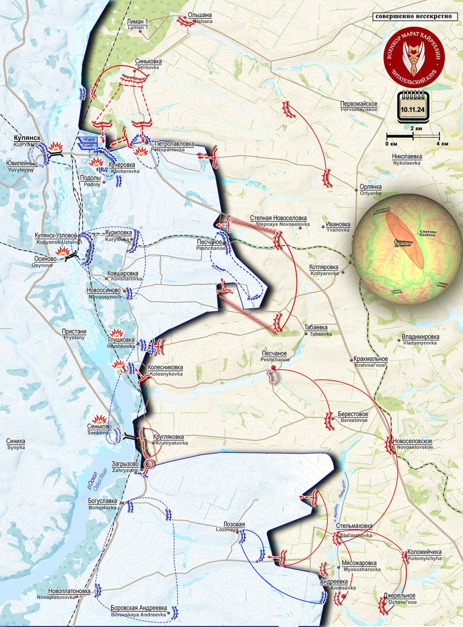 Сватово-Купянск. ВС РФ продолжают штурмовые действия в районе Петропавловки. Локальные бои идут в Загрызово, в Кругляковке закрепляются на занятых позициях. Под давлением остаются силы противника в районе Лозовой с высот западнее Стельмаховки, пишет Телеграм-канал «Кременная.РФ».