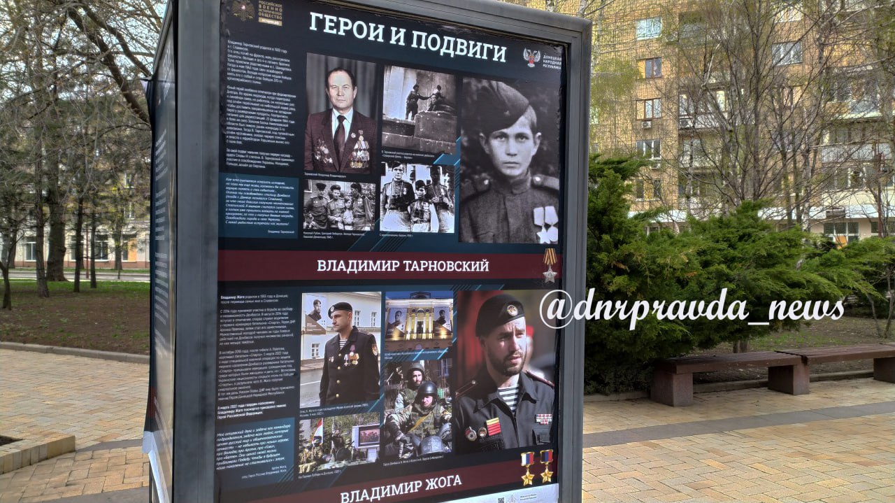 Экспозиция посвящена выдающимся воинам Великой Отечественной войны и СВО. Рядом с героями прошлых лет находятся фотографии защитников Донбасса -  Владимира Жоги и Ольги Качуры.