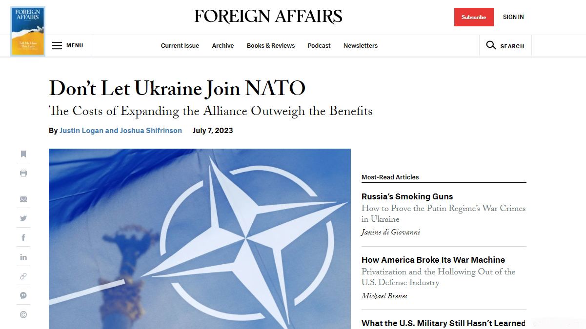 «Если это решение примут, оно будет иметь серьёзные последствия для США, Европы и других стран. Во времена холодной войны альянс избегал расширения на государства, рискующие подвергнуться нападению. Ведь доктрина НАТО предписывает союзникам сражаться и умирать друг за друга, а этого никому не хочется. Особенно в случае с Украиной, которой противостоит ядерная держава. Риски, связанные с принятием Украины в НАТО, серьёзно перевешивают любые выгоды для всех остальных стран альянса», – Foreign Affairs ставит точку в сериале «путь Украины в НАТО».