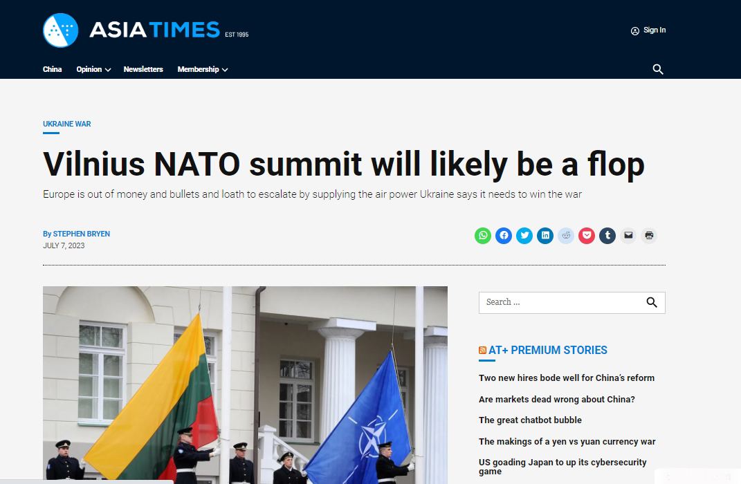 «Украине не стоит рассчитывать ни на план действий для членства в НАТО, ни на «дорожную карту» или особый режим партнёрства. Западные страны уже устали от войны и от Украины в частности. У Европы больше нет ни денег, ни снарядов. Она не в настроении давать Украине карт-бланш и рисковать большой войной, которая может распространиться на Европу. Президенту Байдену будет трудно выжать из европейцев больше. Поэтому сейчас Запад «сливает» Украину как и все годы до этого, постоянно обещая ей, что вот-вот она попадёт и в НАТО, и в ЕС», – пишет Asia Times.