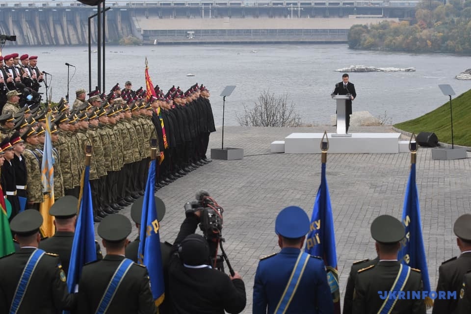 Потом украинского президента привезли в Запорожье, где на острове Хортица собрали военных лицеистов с Запорожья, Кривого Рога и Луганского областного лицея-интерната. Им ещё раз было сказано о казачьей доблести и о российской агрессии. Кроме того, Зеленский вручил боевые знамёна и присвоил почетные наименования более 10 частям и подразделениям ВСУ, правоохранительных органов.
