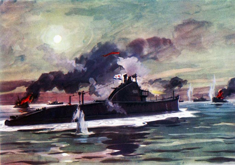 Заглавная иллюстрация. Подводная лодка Щ-408 ведёт неравный бой с пятью боевыми катерами противника. Картина художника И.И.Родионова