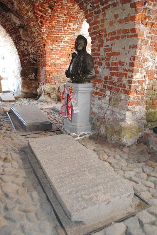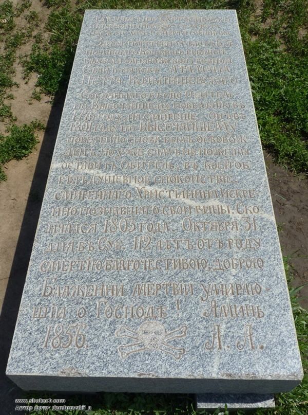 Здђсь погребено тђло въ Б-зђ почившаго Кошевого бывшей нђкогда запорожской грозной Сђчи Казаковъ Атамана Петра Кольнишевскаго Сосланнаго въ сію Обитель по Высочайшему повелђнію въ 1776 году, на смиреніе. Онъ въ 1801 году по Высочайшему повелђнію снова былъ освобожденъ, но уже самъ не пожелал оставить Обитель, въ коей обрђлъ душевное спокоиствіе, смиреннаго Христіанина искренно познавшаго свои вины.