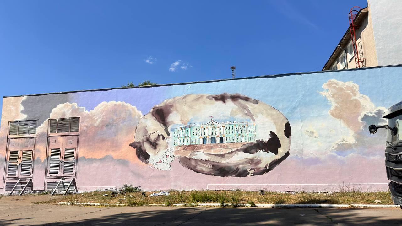 На стене Луганского цирка появился мурал с котиком, созданный по рисунку 15-летней дончанки Марии Руцинской. Маша – победительница общероссийского конкурса «Портрет Эрмитажного кота-2024». Работу школьницы на стену перенесла команда художников из ДНР.