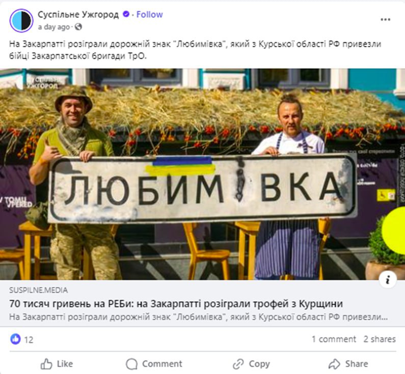 Но сейчас они превзошли все ожидания. Интернет-ресурс «Суспильное Ужгород» выложил фотографию с боевиками, стащившими дорожный знак, который стоял на въезде в Любимовку. Сделали это «захисники» из 101-й Закарпатской бригады ТРО.