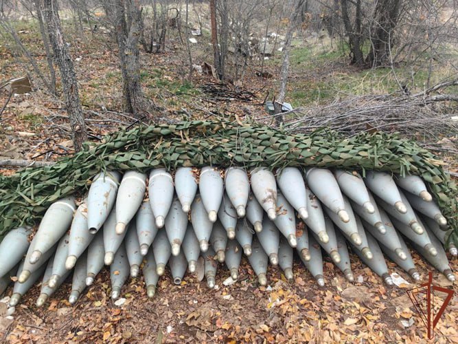 Там бойцы обнаружили тайник, в котором находилось около сорока 152-мм артиллерийских снарядов, свыше 300 патронов различного калибра, гранаты с детонаторами, два противотанковых гранатомёта производства стран НАТО.