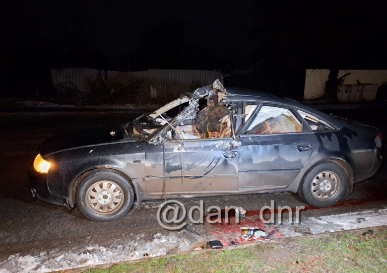Гражданский легковой автомобиль после нанесённого удара БПЛА ВСУ в жилом массиве «Комсомолец» (Никитовский район) в Горловке показал Телеграм-канал На самом деле в Донецке.
