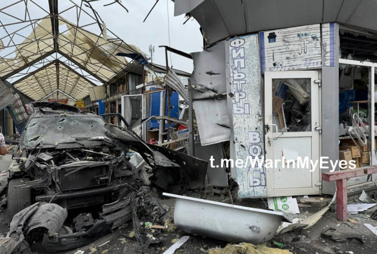Очередной чёрный день в истории Донбасса. Сегодня около полудня вооружённые формирования Украины нанесли удар по торговым рядам рынка «Сокол» в Донецке. Уничтоженные торговые точки, повреждённые автомобили и оборванные человеческие жизни.
