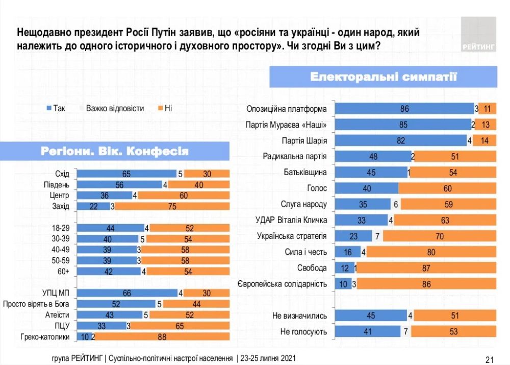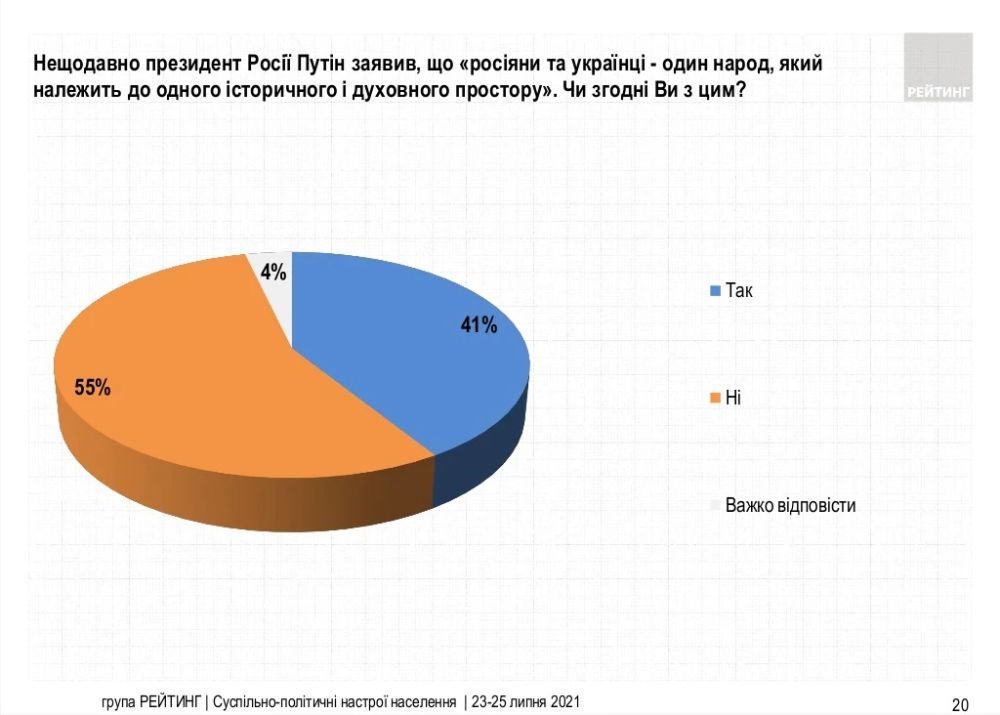А по мнению украинского общественного деятеля Александра Скубченко, 41% согласных с российским президентом – это много, если учесть семь лет тотальной украинизации, русофобства и дискриминации всего русского. Однако всё это не смогло превратить за эти годы Украину в тотальную анти-Россию.