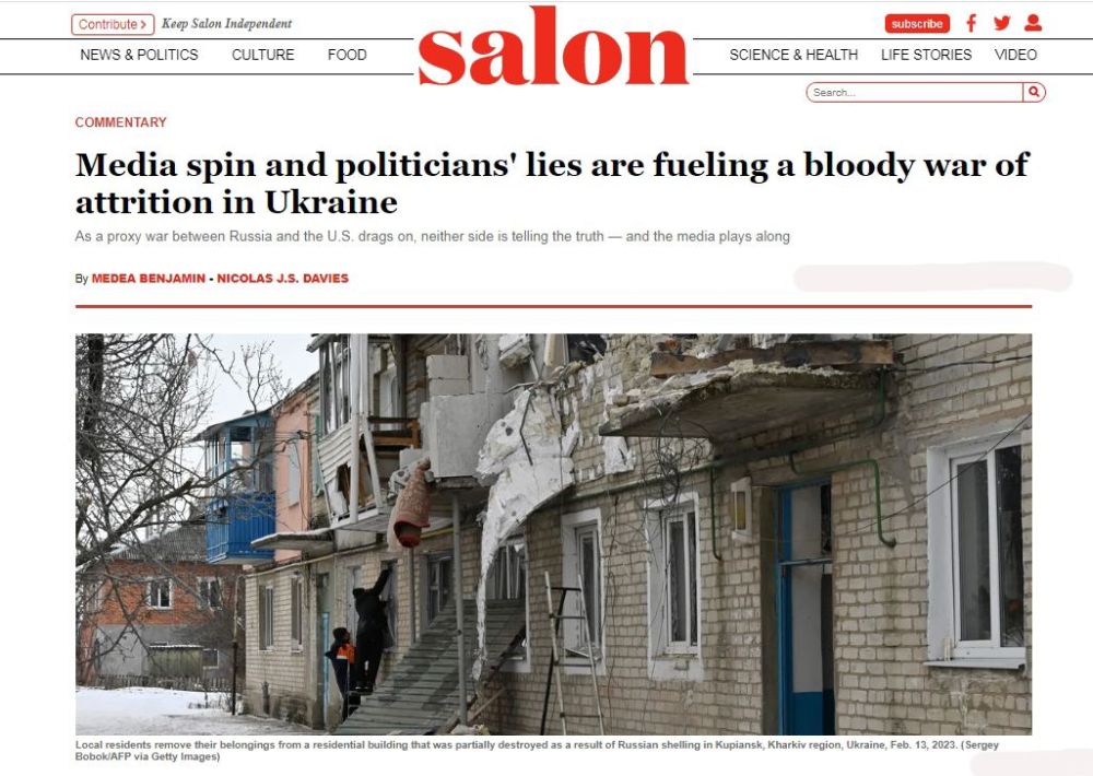 «Общеизвестно, что первая жертва любых боевых действий – это правда. Но раскручивание спирали лжи имеет глобальные последствия в конфликте, в котором сотни тысяч реальных людей сражаются и умирают. Ив Смит (Yves Smith), редактор журнала «Голый капитализм» (Naked Capitalism), исследовал эту коварную связь между информационной и реальной борьбой в статье под названием «Что, если бы Россия выиграла военный конфликт на Украине, а западная пресса этого не заметила?». Он отметил, что полная зависимость Киева от поставок оружия и денег от западных союзников дала жизнь триумфальному нарративу о том, что Украина побеждает Россию и будет продолжать одерживать победы, пока Запад продолжает присылать ей больше денег и всё более мощное и смертоносное оружие»,