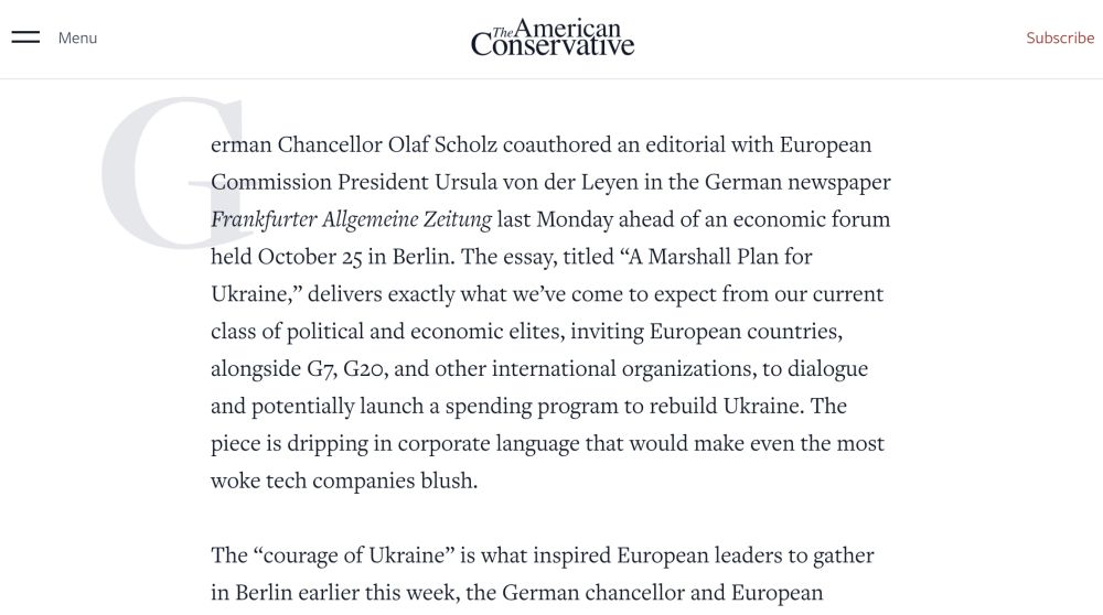 «Перед экономическим форумом, который состоялся 25 октября в Берлине, канцлер Германии Олаф Шольц и президент Европейской комиссии Урсула фон дер Ляйен опубликовали колонку в немецкой Frankfurter Allgemeine Zeitung. Эссе под названием «План Маршалла для Украины» представляет собой то, чего мы и ожидаем от нынешней политической и экономической элиты: этот план призывает европейские страны, «Большую семёрку», «Большую двадцатку» и другие международные организации запустить программу расходов на восстановление Украины»,