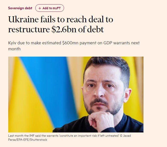 «В следующем месяце Украина должна выплатить 600 млн долларов по ценным бумагам, привязанным к ВВП. Киеву предстоит решить, объявлять ли дефолт по выплате почти $600 млн, которая должна быть произведена в конце мая и связана с экономическими результатами 2023 года, если договориться о реструктуризации не удастся вовремя», – пишет FT.