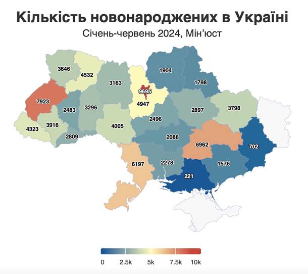 Стабильно мало детей рождается в прифронтовых регионах: на территориях Херсонской области (221 ребенок) и Донбасса (702), подконтрольных киевским властям. В той мизерной части Луганской области, которая остаётся под контролем Украины, за полгода вообще не было зарегистрировано ни одного младенца.
