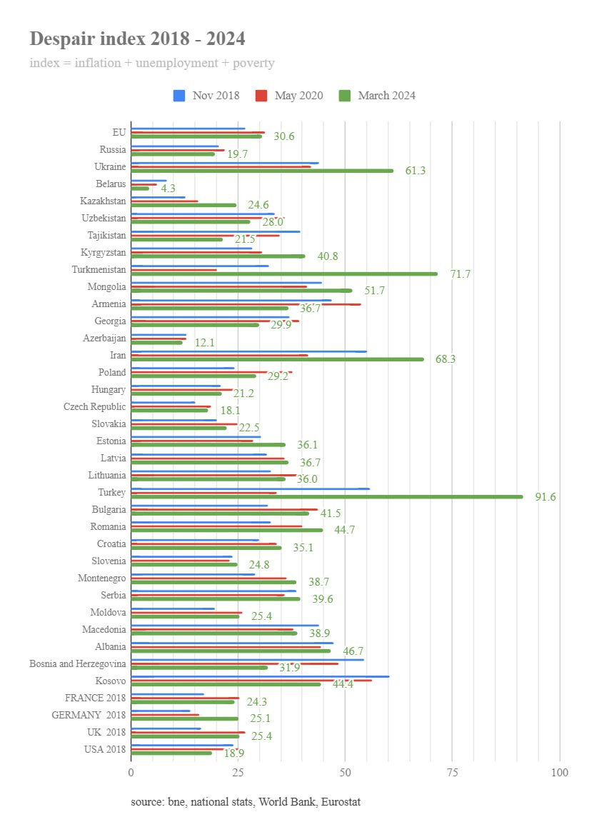 Самый высокий «уровень отчаяния» в мире в Турции (91,6), в Туркменистане (71,7) и в Иране (68,3), Украина на четвёртом месте, но у неё есть все шансы в следующем году стать мировым лидером в рейтинге отчаяния своего населения.