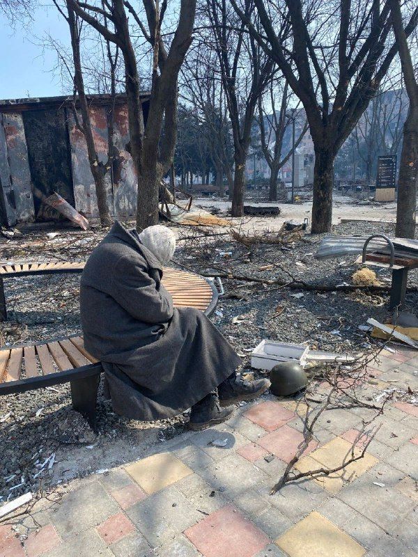 Для меня этот снимок второй символ войны на Донбассе: греющаяся на солнце мариупольская бабушка. Пришла в любимый сквер у проспекта Мира, намёрзлась в подвалах. У ее ног валяется немецкий кевларовый шлем «азовца» с позывным «Бабай». Скорее всего, уже мертвого. «Бабай» был микроцефалом, мне его каска налезла только на колено...