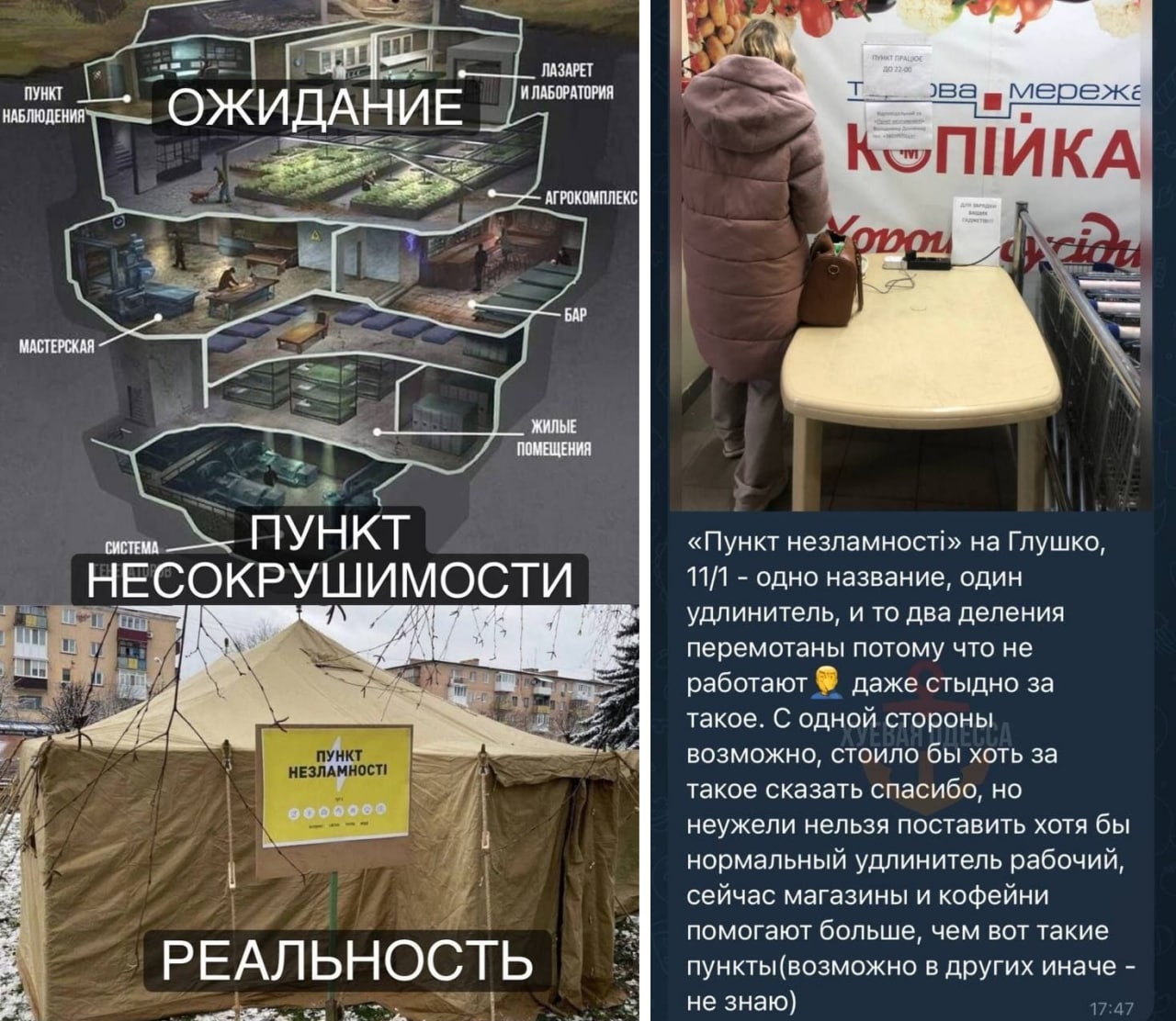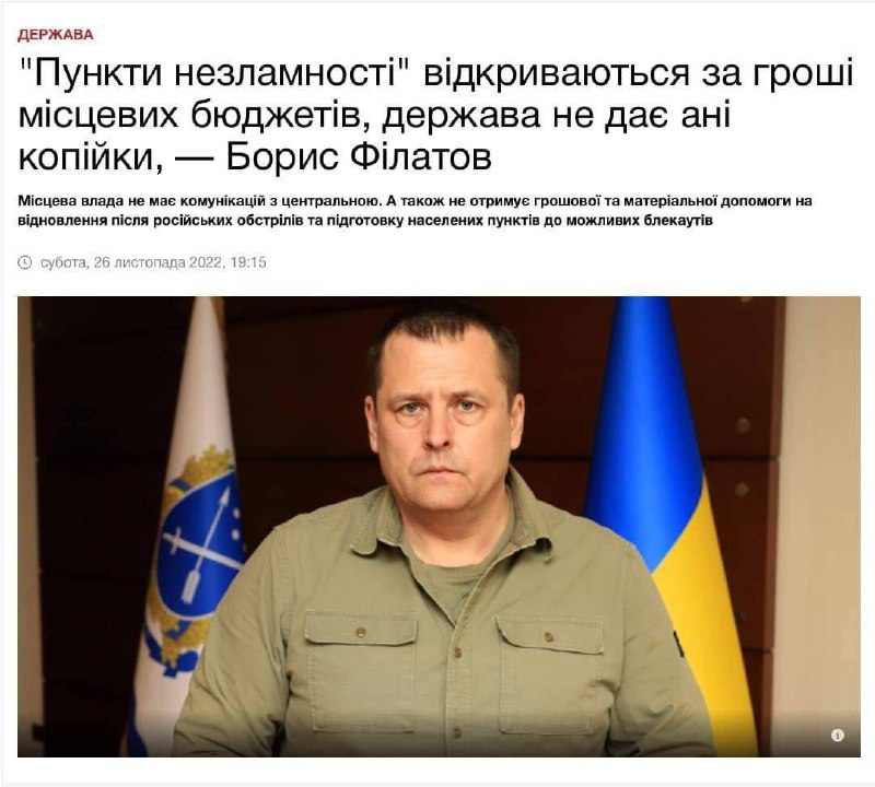 Что-то подобное говорил в серии интервью и мэр Днепропетровска (Днепр) Борис Филатов. Президент, по его словам, дал указание на места, но забыл выделить средства; Киев не общался с местной властью насчёт «пунктов несокрушимости», не выделяет Днепру денег на восстановление объектов после обстрелов и подготовку к возможным блэкаутам. Филатов признаёт, что получает распоряжения открывать «пункты» от главы областной военной администрации, после чего «идём и открываем их за свои деньги».