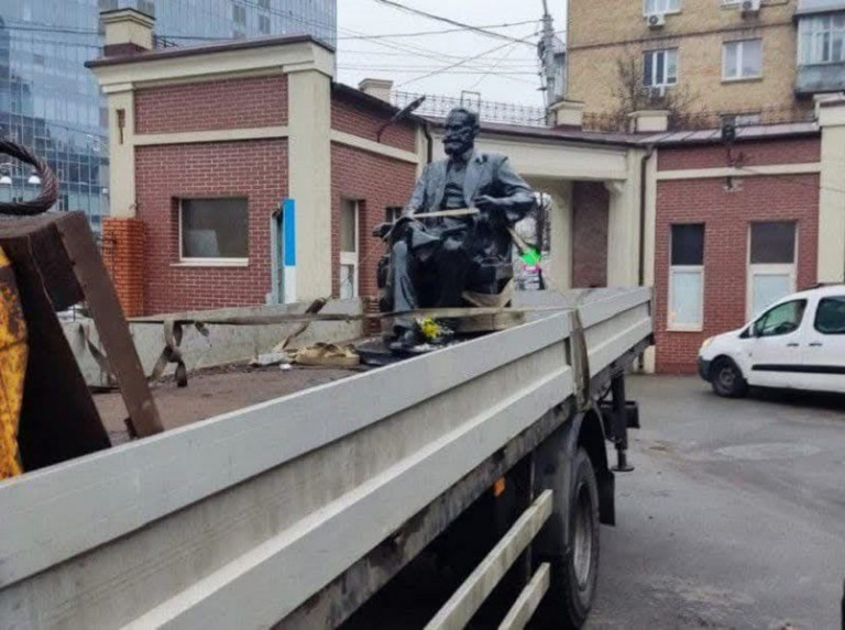 Отвезли памятник учёному на «специальную площадку для бесхозного имущества», а затем отправят на хранение в Государственный музей авиации Украины имени О. Антонова, где складируют другие демонтированные памятники.