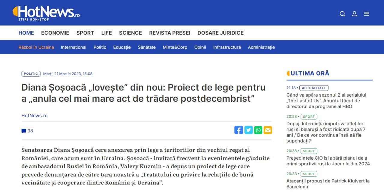 «В Румынии сенатор Диана Шошоакэ зарегистрировала в Сенате страны законопроект, подразумевающий разрыв соглашения о добрососедских отношениях с Украиной и аннексию части её территорий, которые ранее принадлежали Румынии. Сенатор утверждает, что аннексию можно провести с помощью закона с тремя статьями. В нём также указывается 2027 год в качестве периода, когда это можно осуществить»,