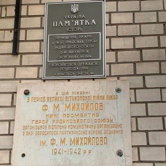 Мемориальная доска была установлена на здании той больницы, во дворе которой доктора Фёдора Михайлова, создателя подпольной антифашиской организации, казнили гестаповцы летом 1942 года.