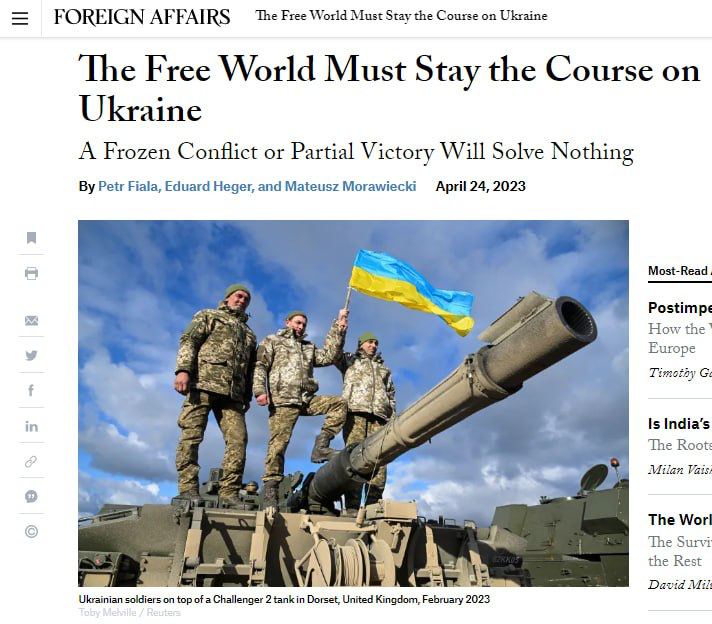 Премьер-министры Польши, Чехии и Словакии Матеуш Моравецкий, Петр Фиала и Эдуард Хегер обратились со страниц американского журнала Foreign Affairs к западному политикуму с призывом не допустить замораживания украинского конфликта и добиться поражения России на поле боя.