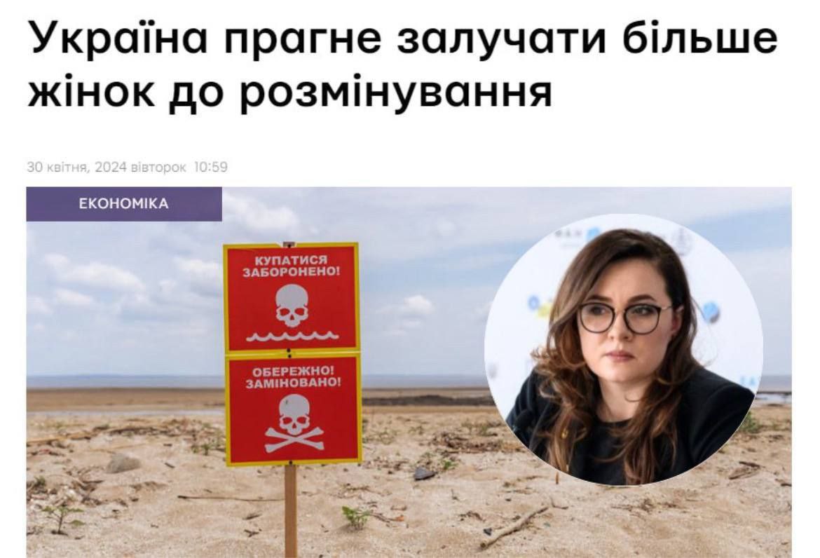 Министр пожаловалась, что у Киева ограничены ресурсы, поэтому Украина не в состоянии заниматься разминированием территорий, для этого не хватает специальной техники и сапёров. Технику, конечно, можно выпросить, но когда это будет – не известно. А сапёров предполагается получить уже прямо сейчас, использовав женское население.