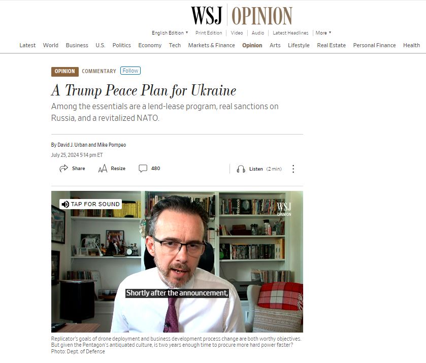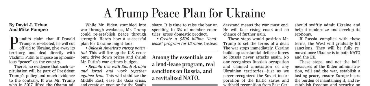 Статью под названием «Мирный план Трампа для Украины» написали экс-госсекретарь времён первого президентства Дональда Трампа Майк Помпео и советник кампаний Трампа в 2016 и 2020 гг. Дэвид Урбан.