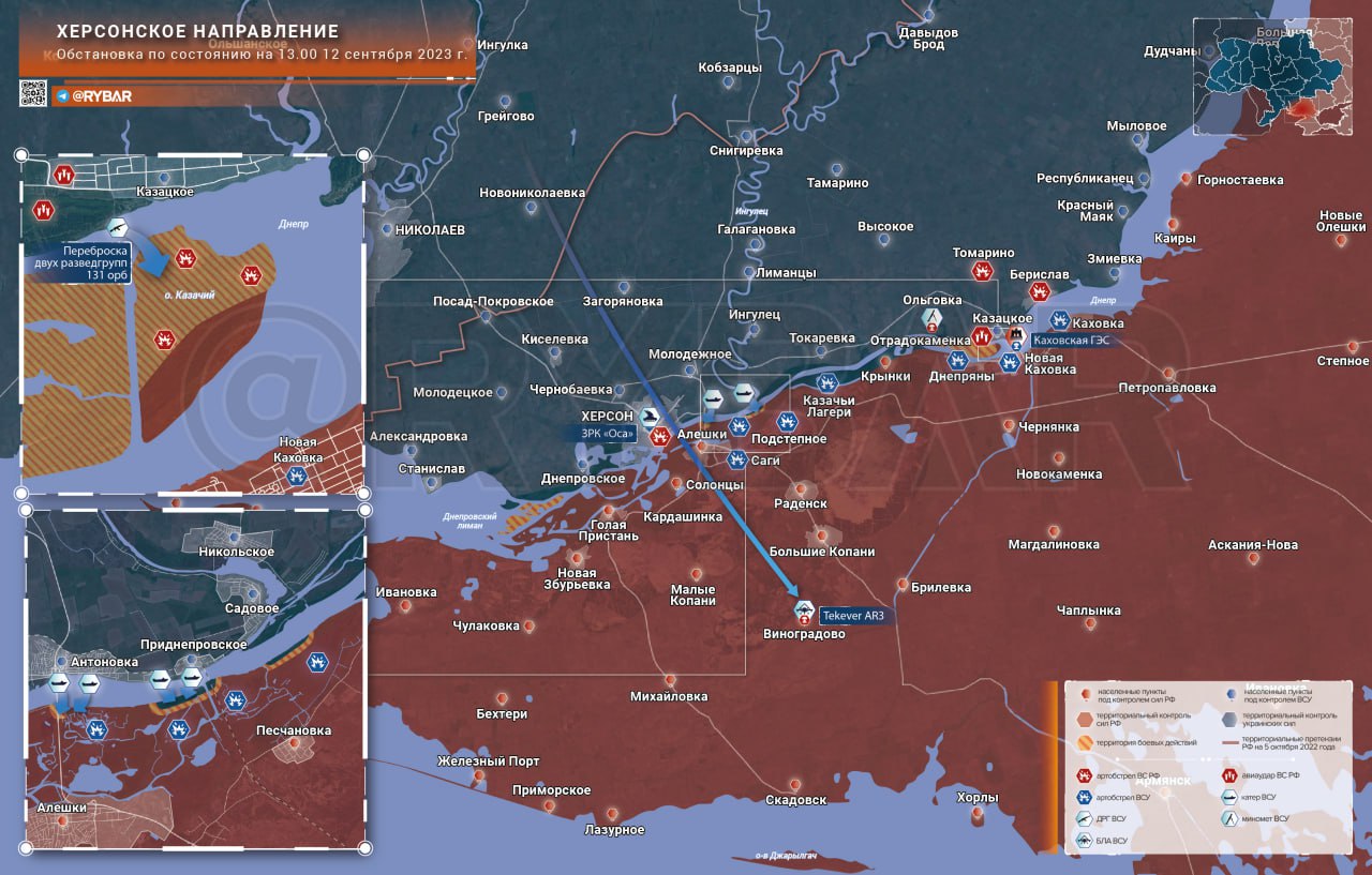 Западнее командование тактической группы «Гром» и 126-й бригады теробороны ВСУ провели ротацию передовых групп на четырёх лодках на островах Алешкинский и Алексеевский, где идёт оборудование наблюдательных пунктов.